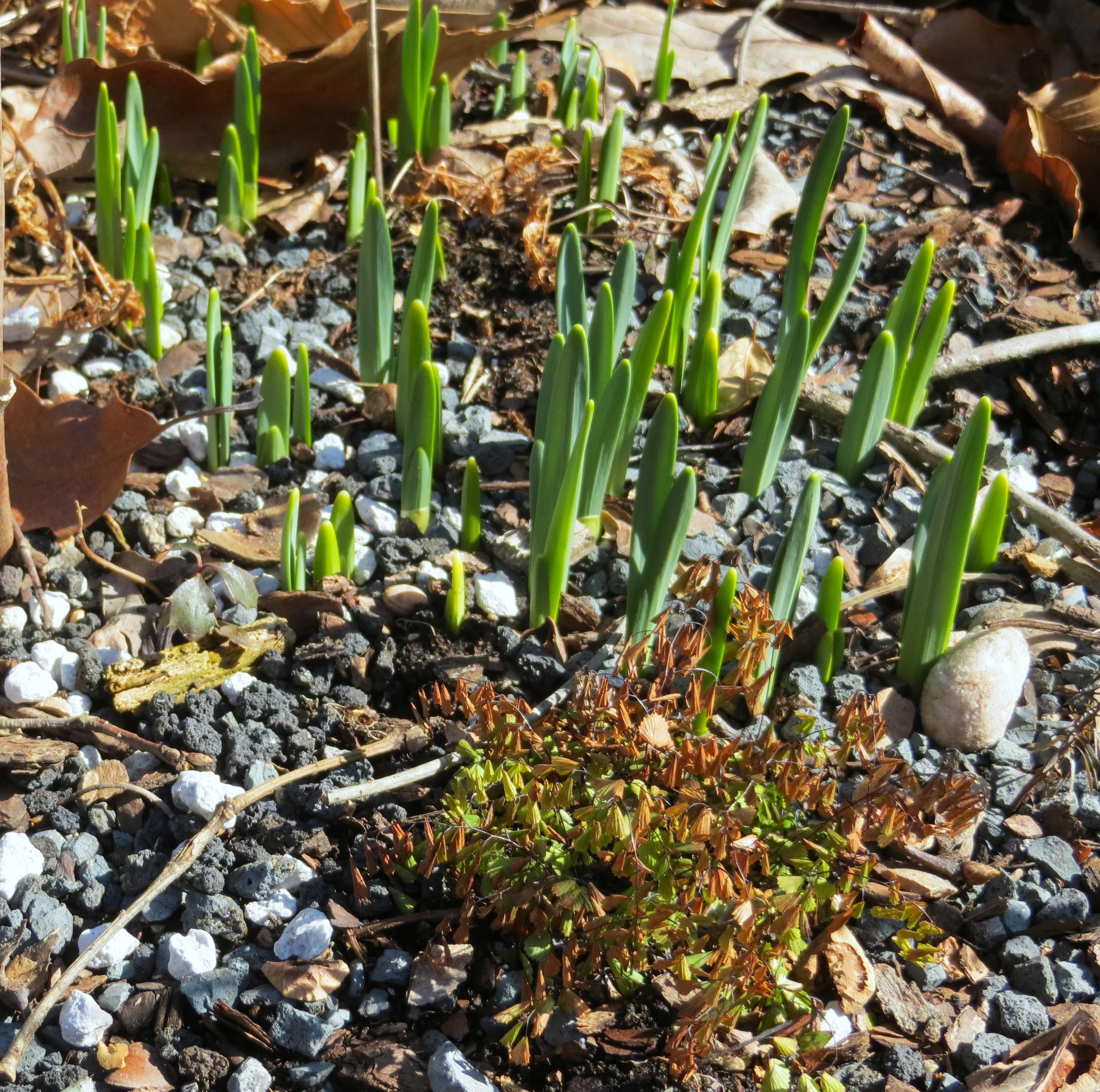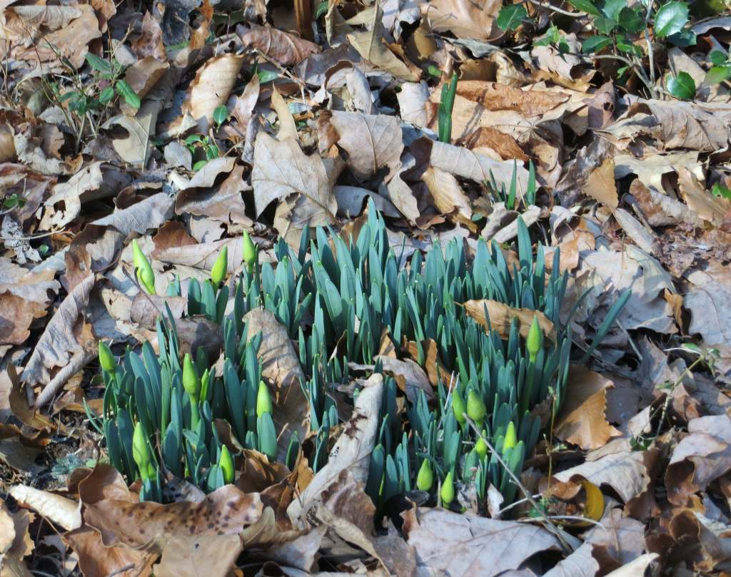 Narcissus flowers, also native in parts of Europe and western Asia, are associated not only with happiness, but with eternal life. Geophytes like Narcissus and Arum, which may appear dead when dormant, reawaken regularly at a particular time of the year, grow, flower, and then die back again just as predictably. Our Narcissus are just beginning to appear because all earlier progress was stopped for several weeks by the very cold weather we’ve had. The snow finally melted, mid-week, after some rain and above freezing days. But the ground remains mostly frozen.