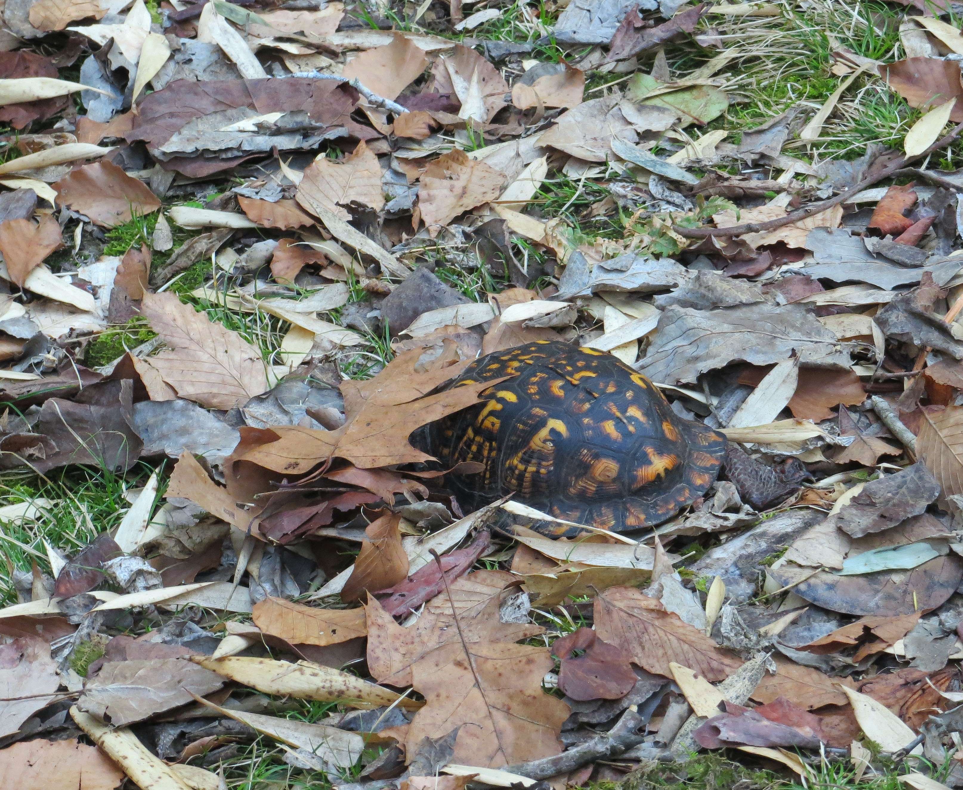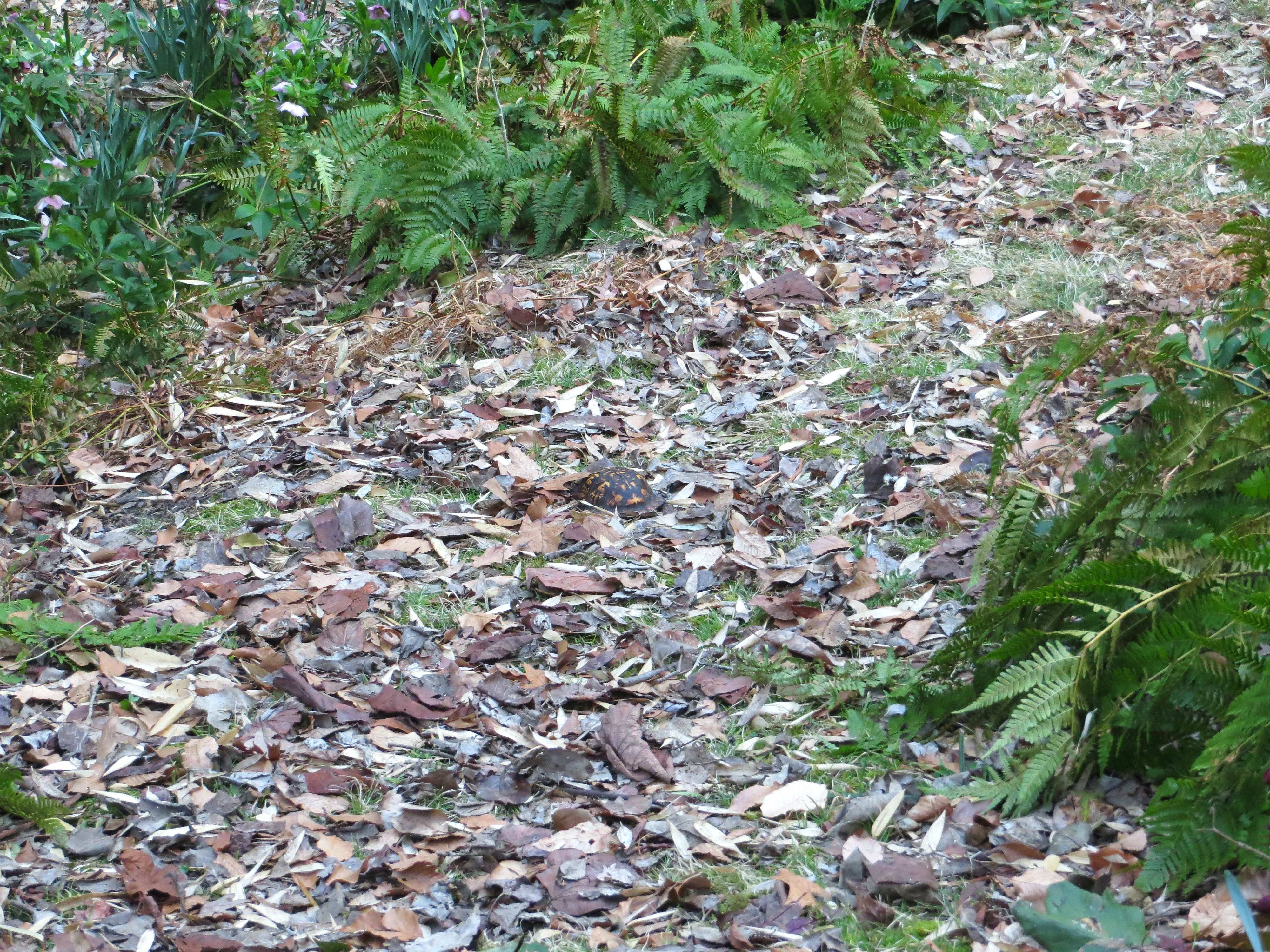 Friday morning, we found a little Eastern box turtle sitting in the middle of a path in our backyard. I tiptoed around it to take some photos, but it never moved. An hour later, it still sat statue-like in the exact same spot. I can only guess that perhaps it woke from hibernation on Thursday afternoon, ventured out in search of something to eat, and cooler temperatures that night sent it back to sleep. It had a fallen leaf pulled up over its head like a blanket, and one foot stuck out as though it had stopped quite suddenly in mid-step. This is the first turtle we have noticed in the yard since last September.